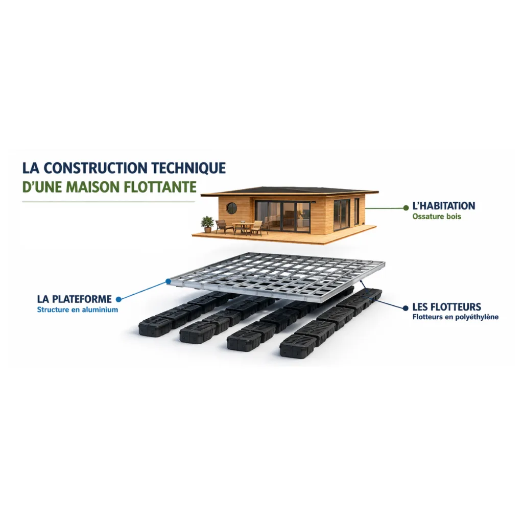 Avant d’entrer dans le détail des systèmes de flottaison, voici une précision importante : une maison sur l’eau n’est pas un bloc monolithique. Elle est composée de trois éléments distincts, chacun jouant un rôle précis dans l’équilibre et la solidité de l’ensemble.